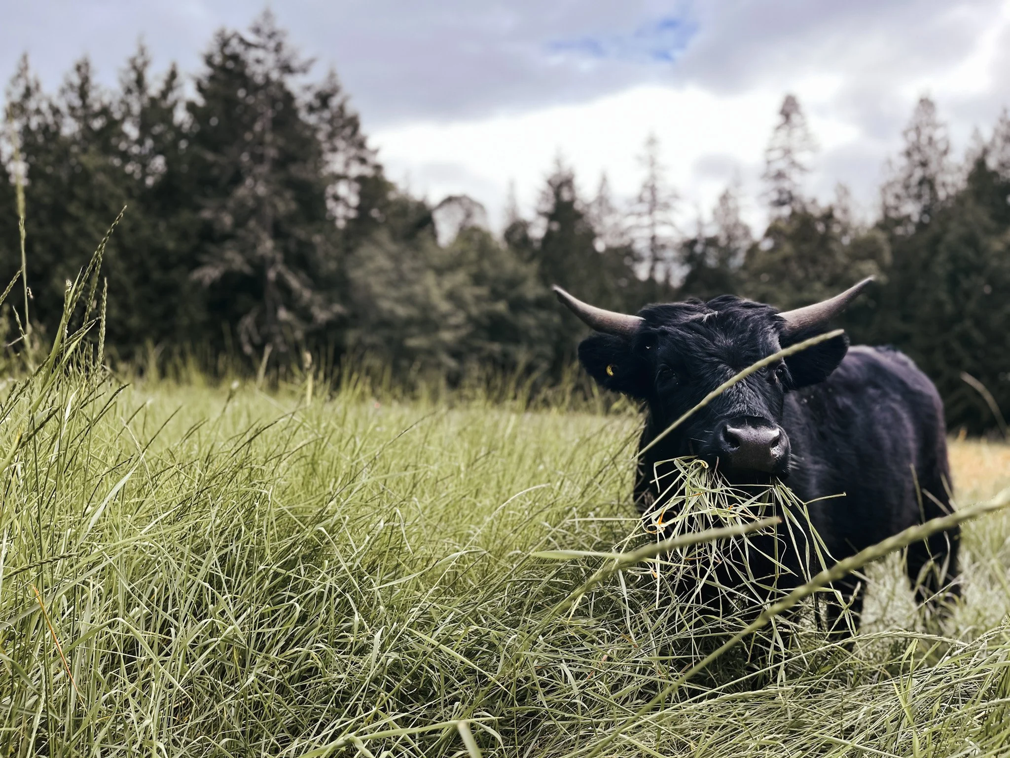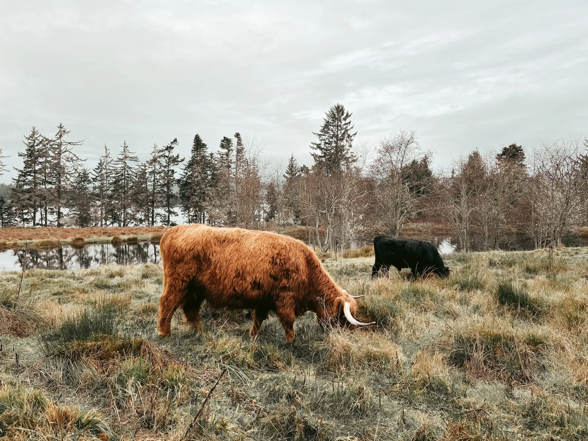 Our Highlands and Highland crosses thrive on pasture and forage, and are not supplemented with grain. Once calves are weaned, they eat local hay, and our grass and forage exclusively. They like to browse (eat trees, shrubs, brambles and bushes) as well, which helps to maintain our pastures.
